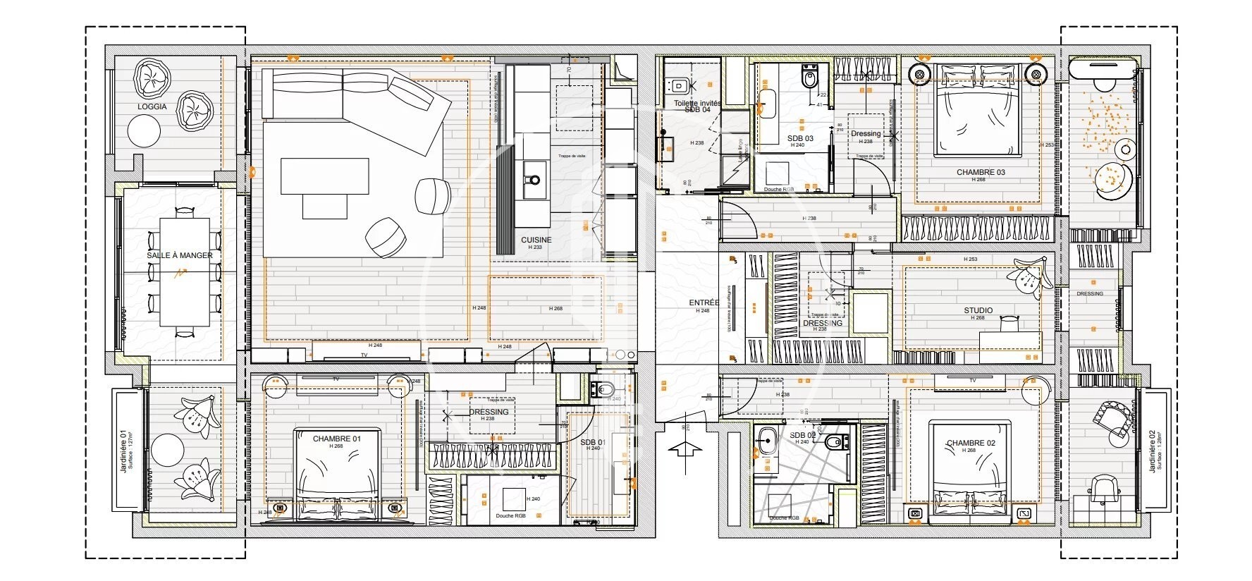 L'appartamento è così composto: ingresso che conduce a un ampio doppio soggiorno con sala da pranzo, cucina a vista completamente attrezzata, tre spaziose camere da letto con bagno en suite, tre bagni, uno studio utilizzabile come ufficio e un bagno per gli ospiti.