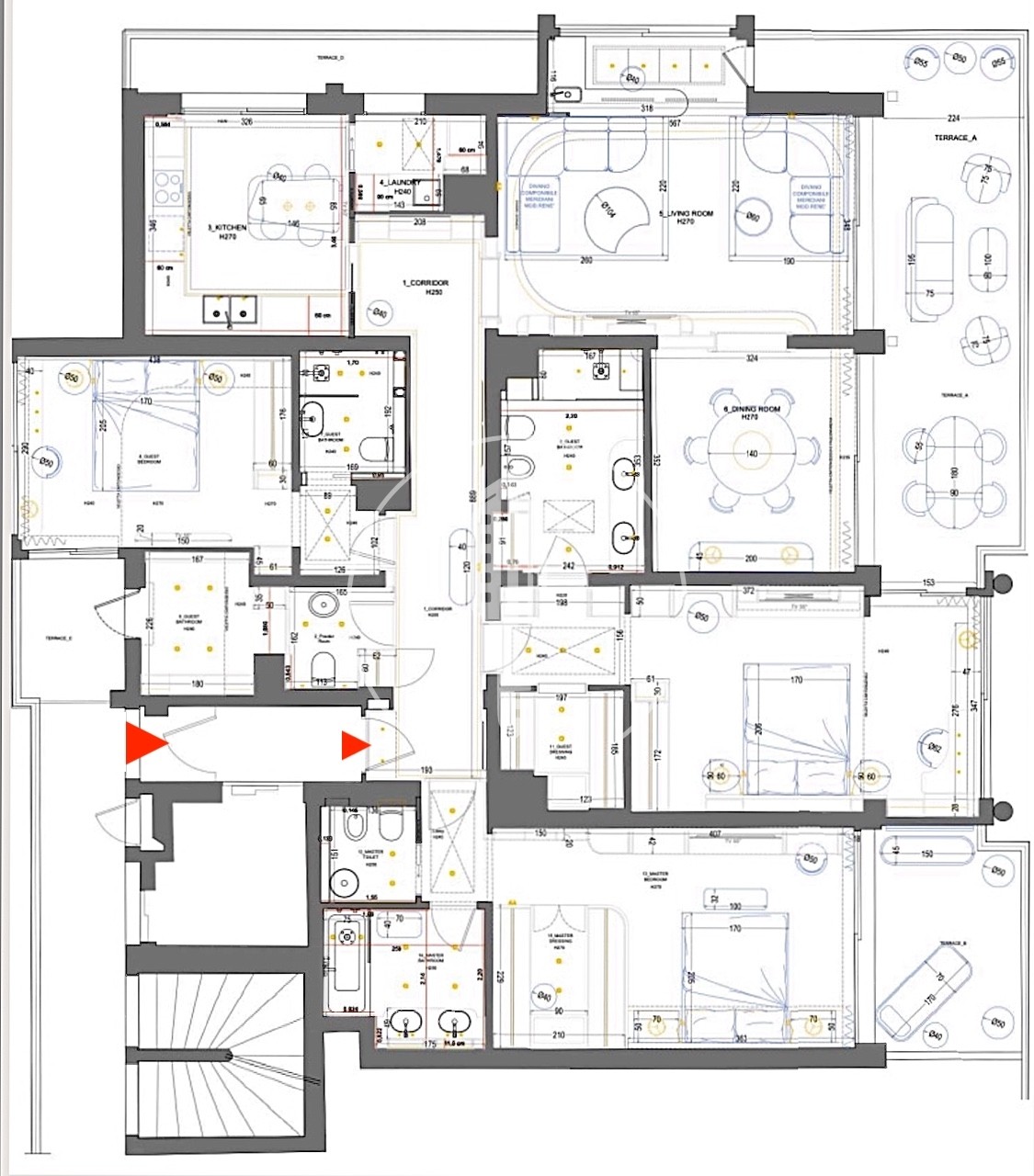 Entrée, dégagement, double et lumineux salon - salle à manger avec bar et grande terrasse donnant sur le Casino et ses jardins ainsi que la mer, trois chambres, spacieuses, avec salles de bains attenantes et dressings, cuisine entièrement équipée, une buanderie, toilettes pour invités, une chambre de service.